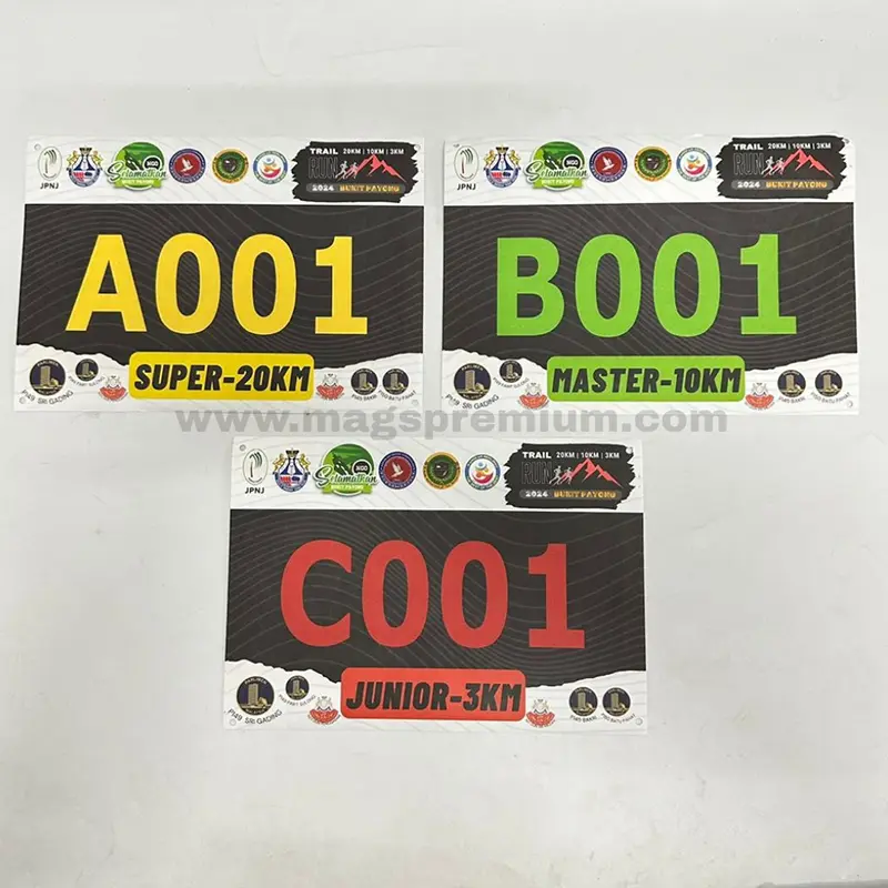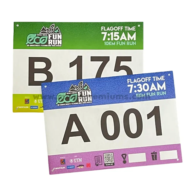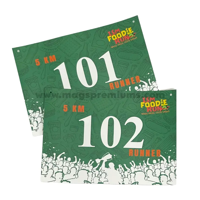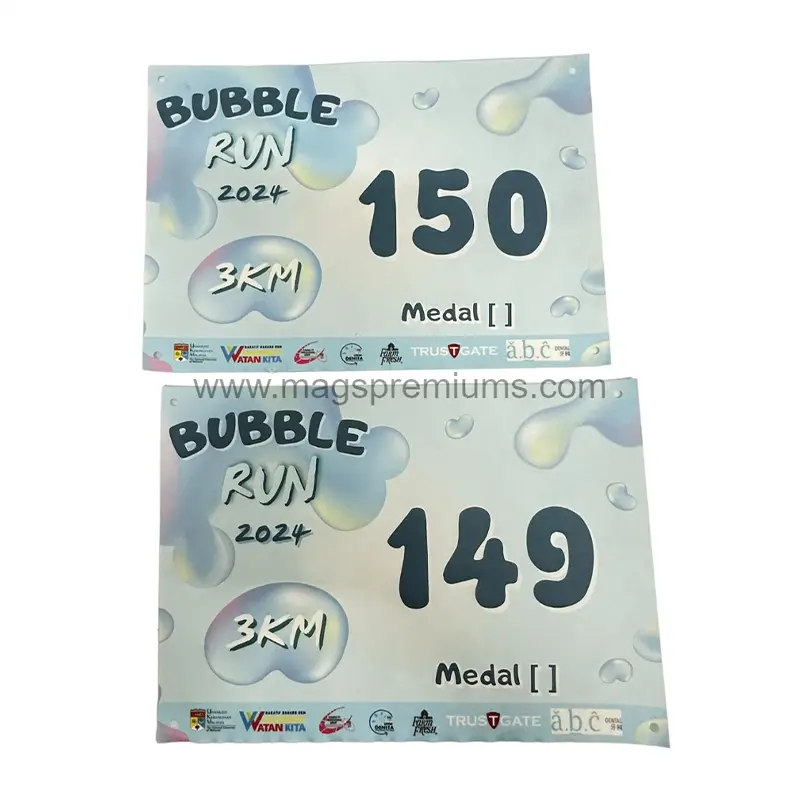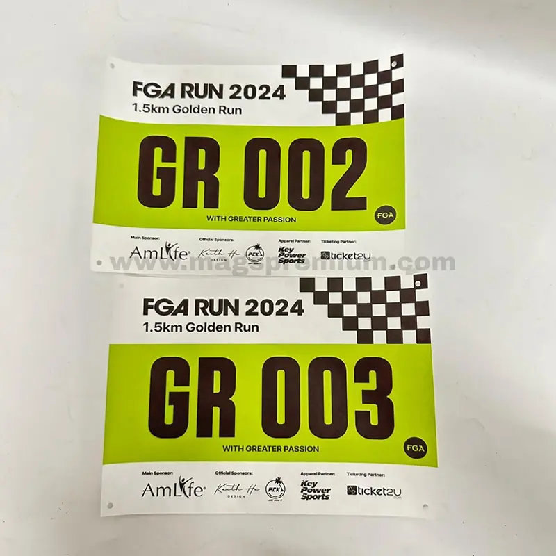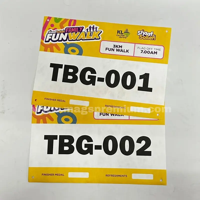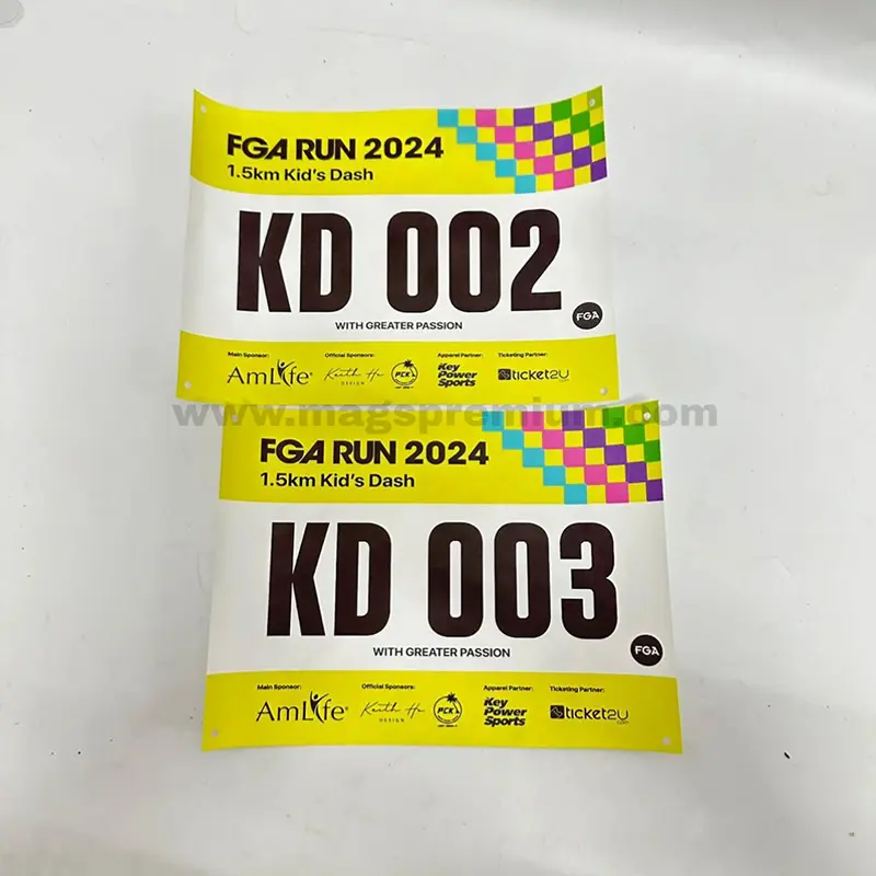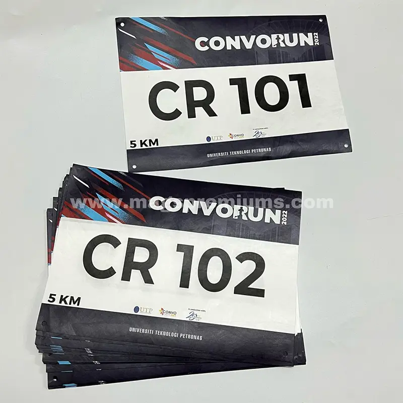 Our running bib printing service allows full customization to match your event theme. You can personalize each bib with participant numbers, event logos, sponsor branding, and even individual names. Printed on durable, lightweight material, the bibs are clear, tear-resistant, and comfortable to wear throughout long-distance activities.
